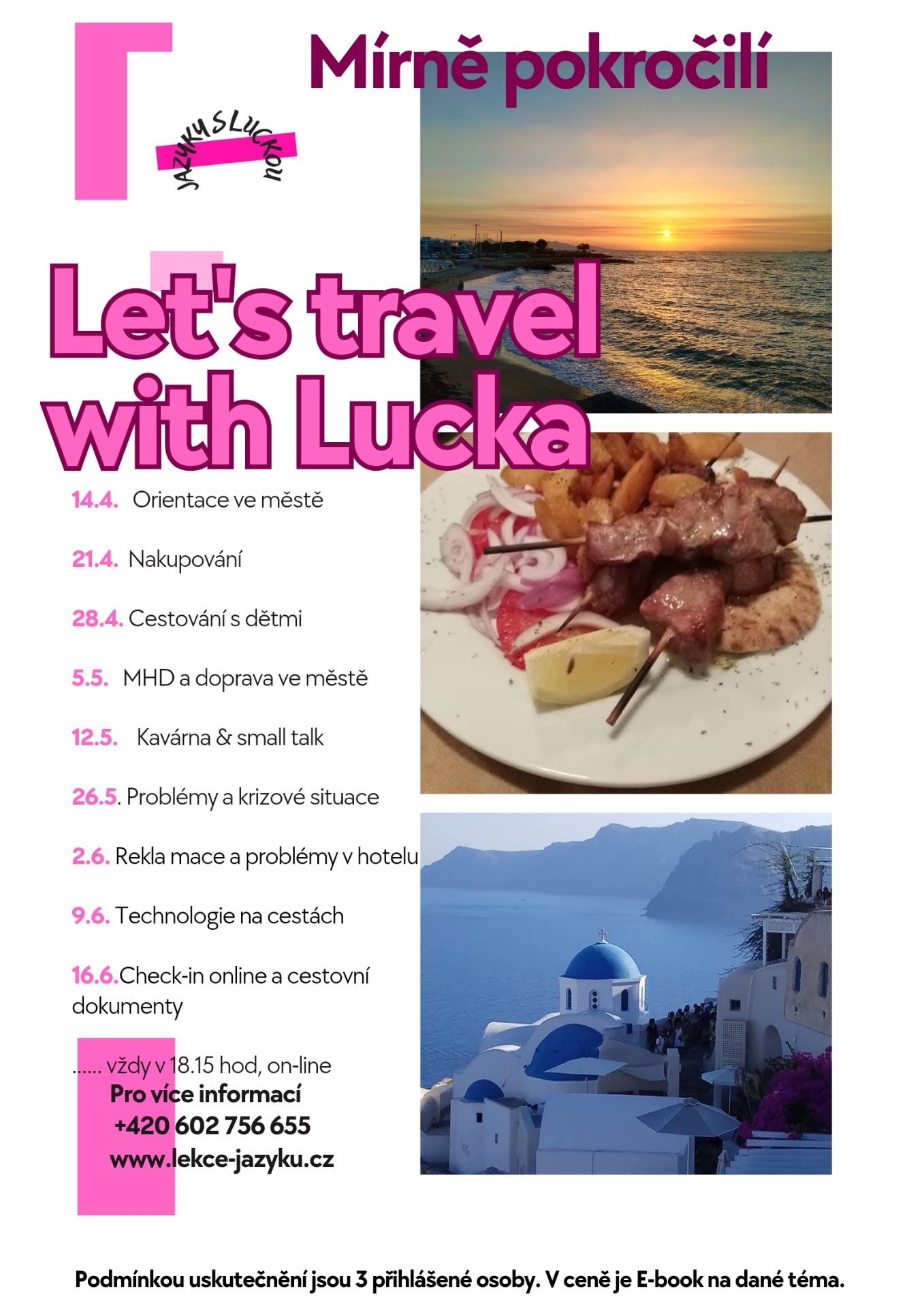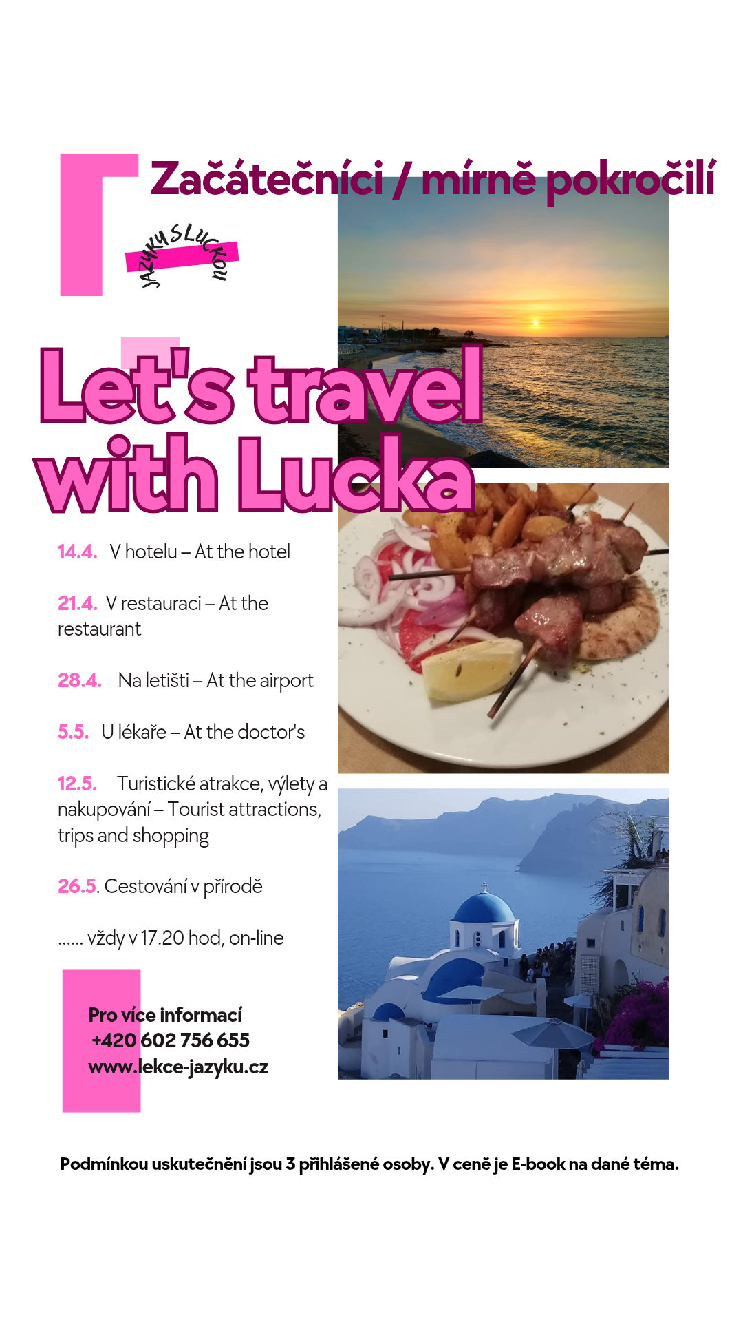 Jazykový kurz Nebojte se cestovat s Luckou bude otevřený při minimálním počtu 3 osob. A pokud byste se někdy nemohli dostavit, nebojte se, vše zvládneme .. :)